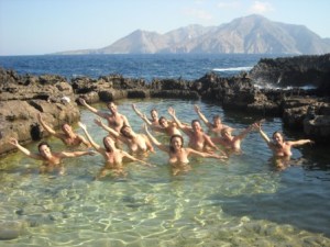 A poca distanza è vero che c’è un antico insediamento, addirittura di epoca dorica, ma non aveva senso prelevare delle pietre qui per portarle là. Non ci sono sentieri che la raggiungono, ma solo tracce che si perdono tra le rocce affioranti e taglienti come coltelli. Solo a saperne l’esatta collocazione e traguardando un palo di legno si può raggiungere, ma non sempre si trovano così tante ragazze al bagno!